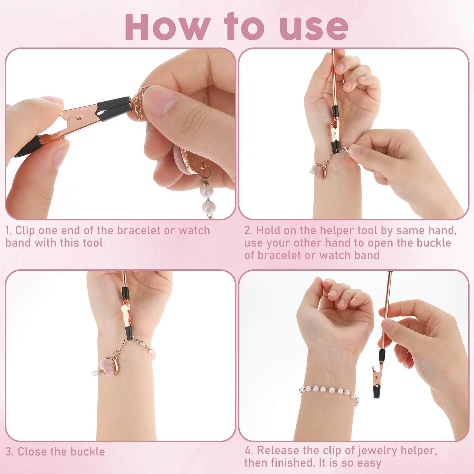 【Easy to Use】Bracelet clips can help you put on the bracelet easily and quickly without any help from others. Just press the end of the assistant, then press the clip to fix the end of the bracelet, and finally fasten the clasp with your other hand.