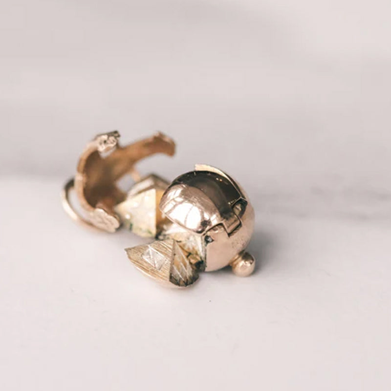 This pendant is a masterclass in vintage ingenuity! It begins as a sleek, hinged sphere – unlock the top hinge cage, and it unfolds into a cross shape with six pyramid tips pointing upward. Each pyramid face is etched with iconic Masonic symbols – think the Square & Compasses, All-Seeing Eye, Skull & Crossbones, Star of David, and more. It’s a hidden code, a fraternal identifier, and a work of art rolled into one tiny treasure.