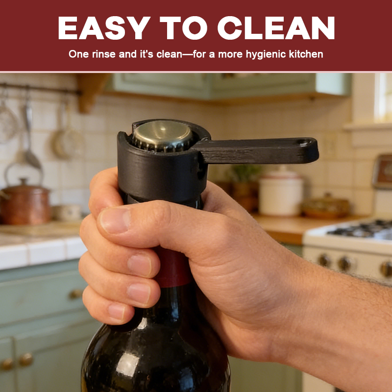 The enclosed cylindrical housing neatly covers the bottle top, preventing the cap from flying away or falling onto the floor. It keeps the process clean and controlled, so you never have to chase a rolling bottle cap again.