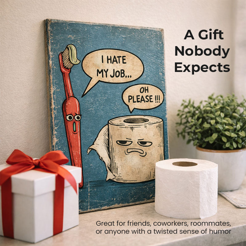 This hilarious decoration features a miserable toilet paper roll begging for mercy while the toothbrush announces, “I hate my job…”
