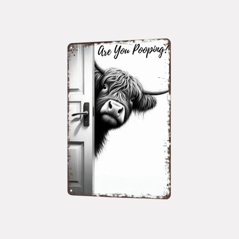 "Knock, knock! Who's there?" It’s your new favorite bathroom companion! Add a heavy dose of laughter to your daily routine with this witty piece of wall art. Featuring a curious Highland cow peeking around a door frame, this sign asks the bold question everyone else is too polite to ask. It is the perfect mix of rustic charm and comedy that guarantees a smile from every guest.
